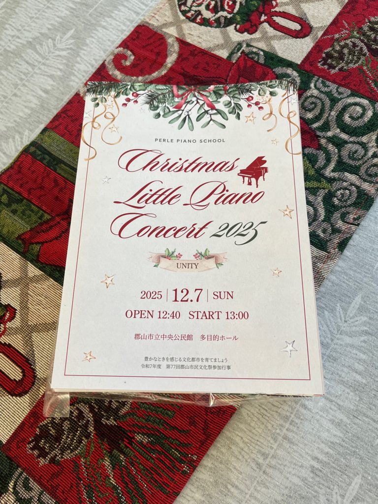 発表会プログラムが届きました♪ お知らせ 教室 音楽 2025年12月1日2025年12月1日 こんにちは。ペルルピアノ教室主宰の池田敦子です。 今日から12月🎄 今年やり残したものは何ですか🪅 プログラムも到着して、あとは一気に発表会仕事を終わらせてしまいたい今日。 なかなか身体がついていきません😅 なんて素敵なプログラム💓 中面も裏面も最高に素敵✨ みなさまにお世話になりながら、発表会を成功させたいと思います! がんばれ、みんな😊 がんばれ、わたし😊 お身体にお気をつけください。