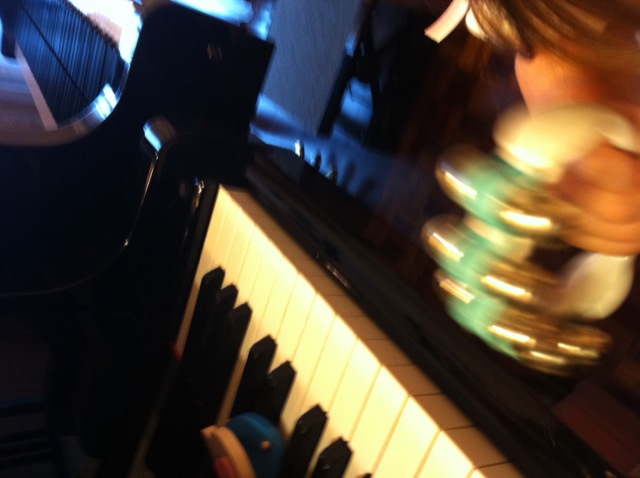 その後、自分から、クリスマスの練習に「ジングルベル」をやると言って、赤い楽譜を開くのをせがまれhappy01.gif、こんどは鈴を叩いたり振ったりしながら、歌いました。