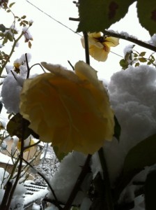 12月になっても、散ること無く咲き続けた庭のバラにも、こんなに雪が!