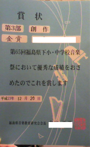、只今お休みしている中学生からは、ある日、作曲が県で金賞を頂いた知らせをもらいました!(市では特選!)